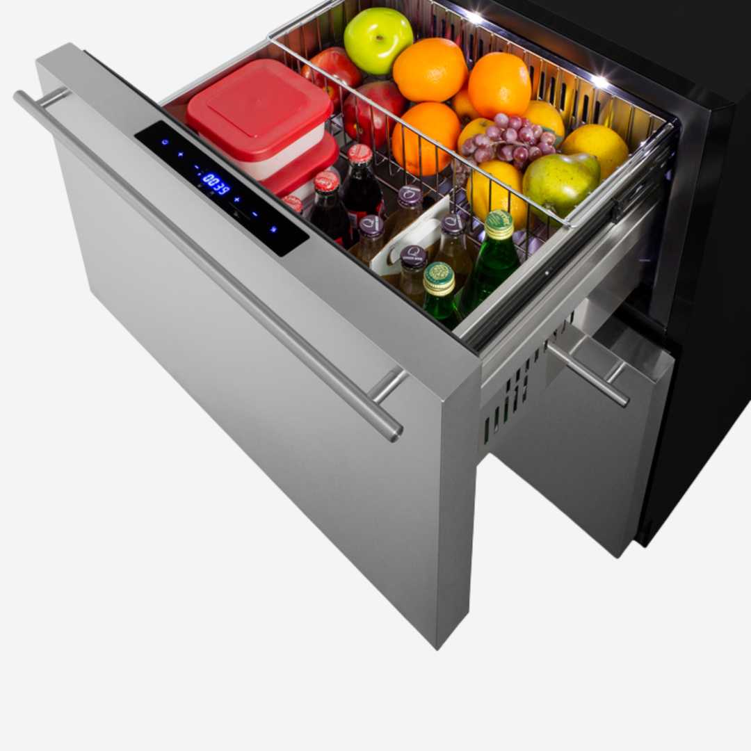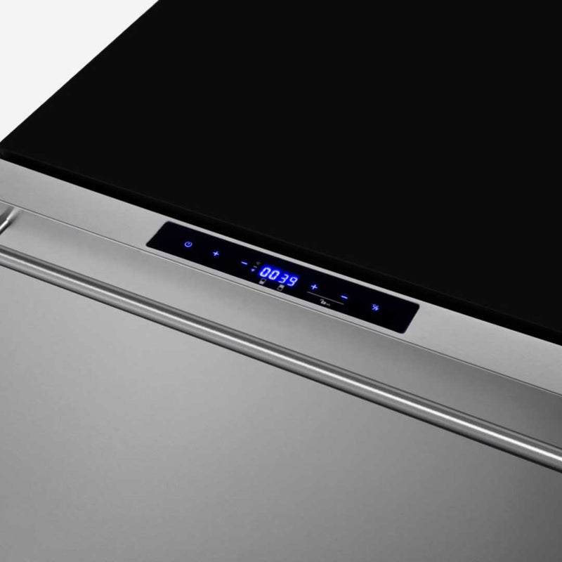 Refrigerador-congelador de 2 cajones ideal para espacios ADA y cocinas interiores o exteriores. Su mayor ventaja es el look a la medida: los frentes aceptan panel overlay para integrarse perfecto a tu carpintería, con interior en acero inoxidable. Ofrece 3.3 cu.ft., sistema frost-free con enfriamiento por ventilación, control digital, divisores y alarmas, además de funciones premium como child lock, memoria por apagón y modo Sabbath. Certificado ETL-S/NSF-7, es rendimiento profesional con diseño completamente integrado.