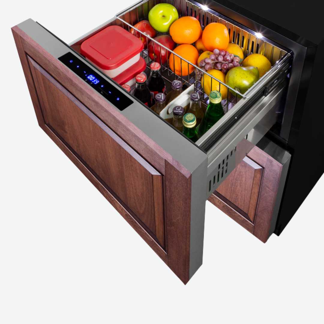 Drawers accept overlay panels (size: 23.43" x 14.1" at 3/4" thick) to let you seamlessly blend the refrigerator into cabinetry design