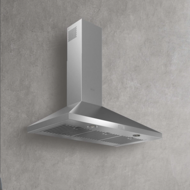 Bolsena, con sus ángulos en forma de pirámide y acabado en acero inoxidable, crea una armonía visual impactante en cualquier cocina. Disponible en 76.2 cm o 91.4 cm, cuenta con controles táctiles retroiluminados, iluminación LED y un motor de 4 velocidades. También incluye una chimenea telescópica para techos de hasta 2.7 metros.