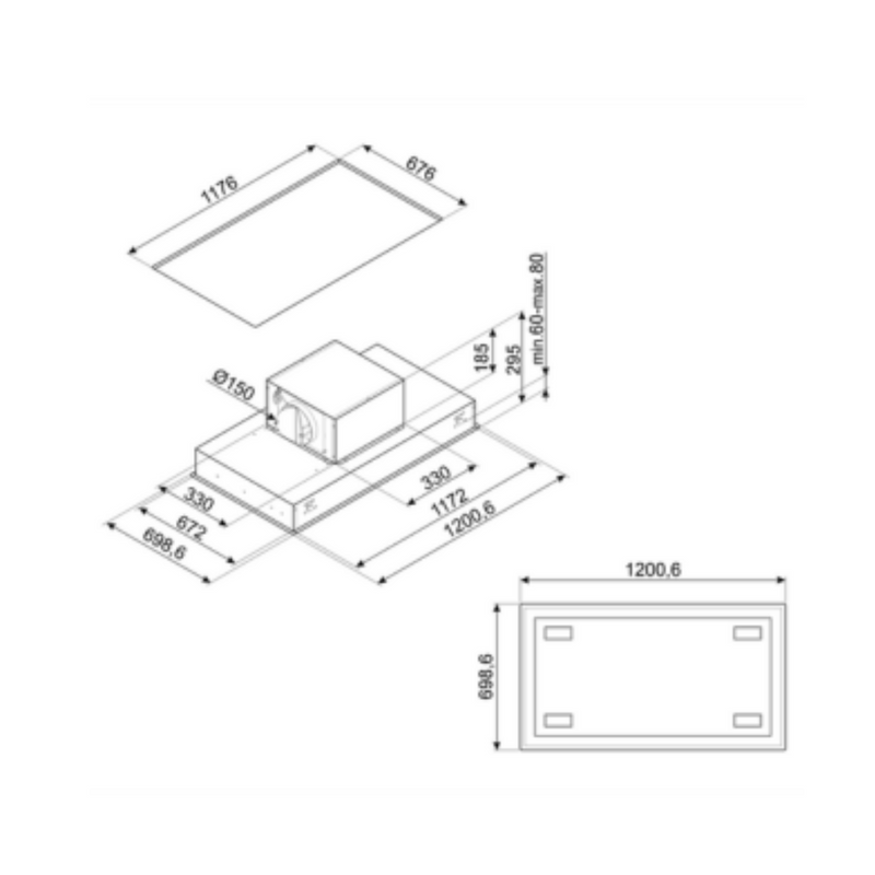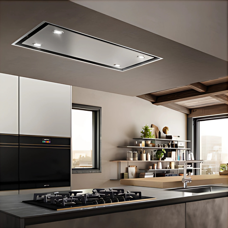 Campana de techo Smeg de 120 cm en acabado acero inoxidable, diseñada para ofrecer una ventilación eficiente y silenciosa en cocinas modernas. Su diseño empotrado permite una integración perfecta con el techo, manteniendo una estética limpia y funcional.