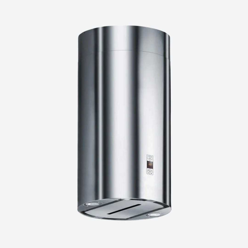 La campana extractora de isla Cylindra Isola cuenta con un cilindro de acero inoxidable con modernos controles LED mediante botones y el innovador sistema de succión perimetral. Puede utilizar el cilindro de acero inoxidable solo o añadir el kit de cristal para un toque de diseño adicional.