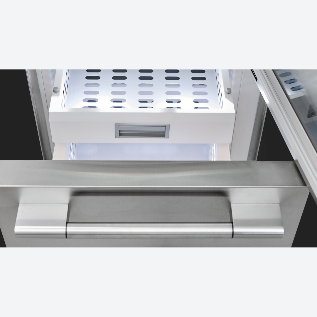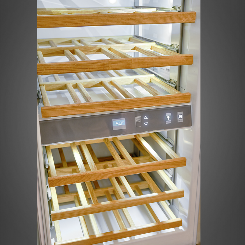Fulgor Milano presenta esta vinoteca profesional de doble zona con cajón TriZone en la parte inferior, transformable en congelador, refrigerador o compartimento para alimentos frescos. Con 9 estantes de madera de haya natural y dos zonas de almacenamiento personalizadas, esta vinoteca puede albergar hasta 54 botellas de diferentes tamaños para satisfacer sus necesidades específicas. El elegante interior de aluminio blanco y la brillante iluminación LED facilitan la búsqueda de cualquier elemento en el interior.