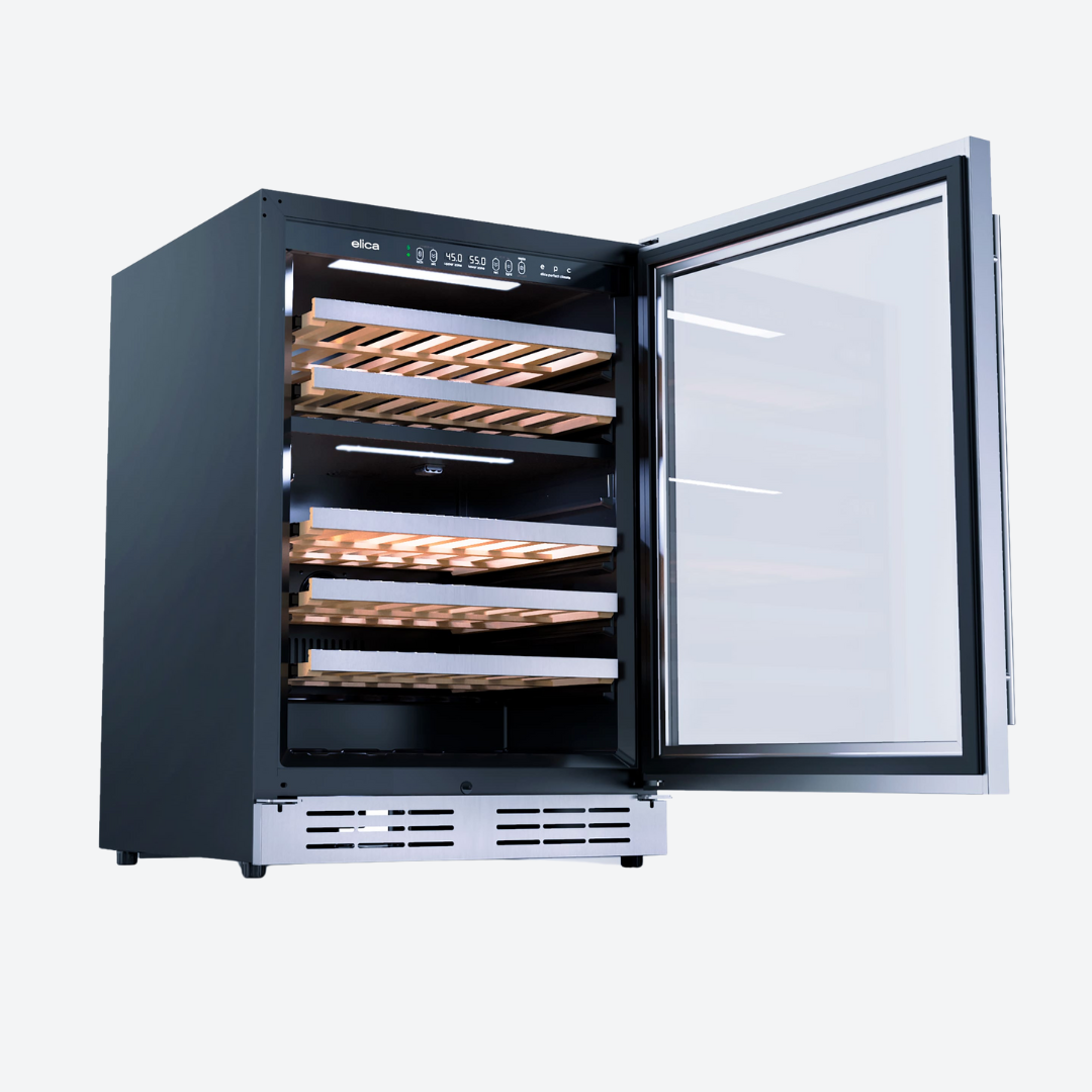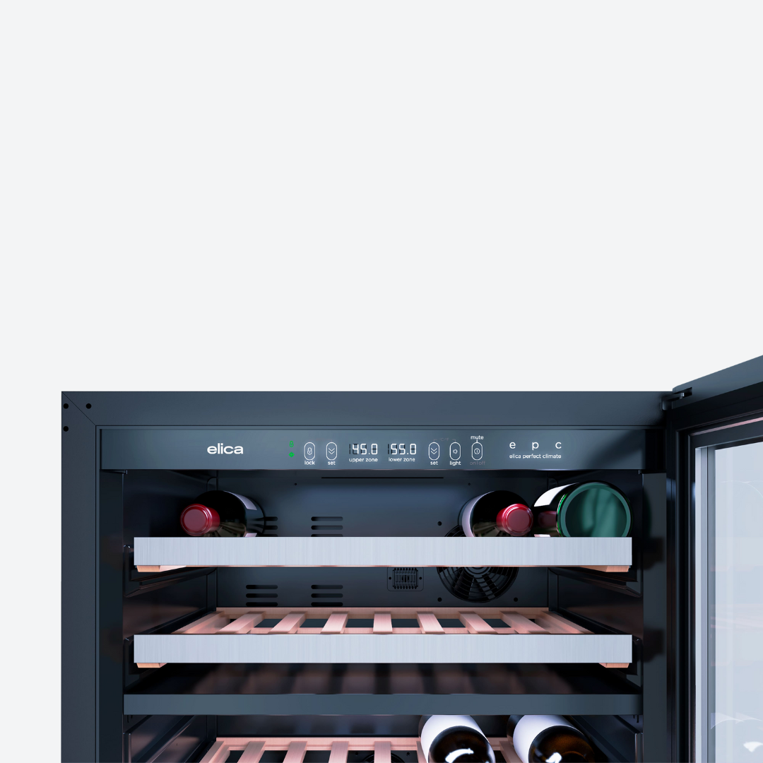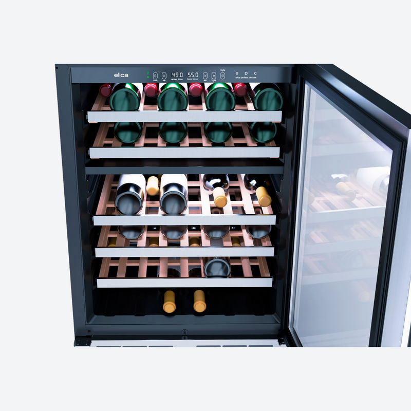 RISERVA - EWS52SS1 con zonas de temperatura dual está diseñado para almacenar una variedad de vinos de calidad y conservarlos en condiciones óptimas. Como líder mundial en ventilación, Elica comprende en profundidad la importancia de mantener la temperatura, la humedad, la luz y las vibraciones bajas adecuadas para garantizar el entorno adecuado para una conservación y un envejecimiento seguros. Los estantes de madera de haya natural RISERVA son de extensión total para un acceso fácil y seguro a cada botella.
