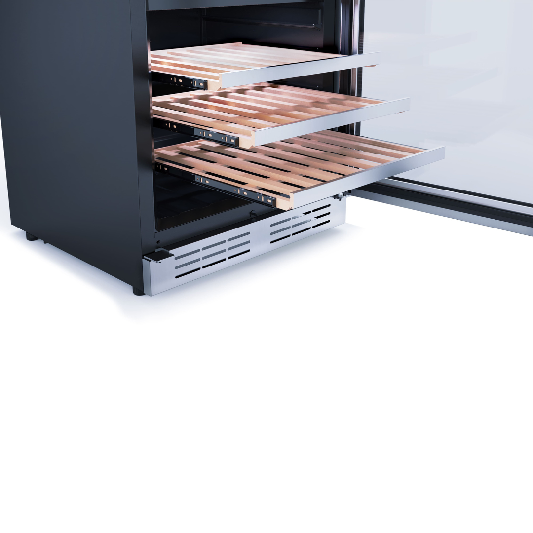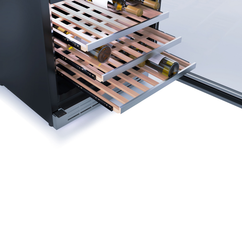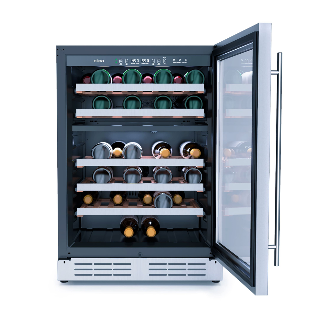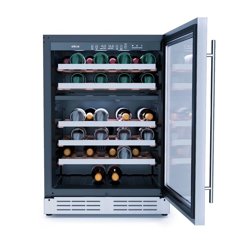 RISERVA - EWS52SS1 con zonas de temperatura dual está diseñado para almacenar una variedad de vinos de calidad y conservarlos en condiciones óptimas. Como líder mundial en ventilación, Elica comprende en profundidad la importancia de mantener la temperatura, la humedad, la luz y las vibraciones bajas adecuadas para garantizar el entorno adecuado para una conservación y un envejecimiento seguros. Los estantes de madera de haya natural RISERVA son de extensión total para un acceso fácil y seguro a cada botella.