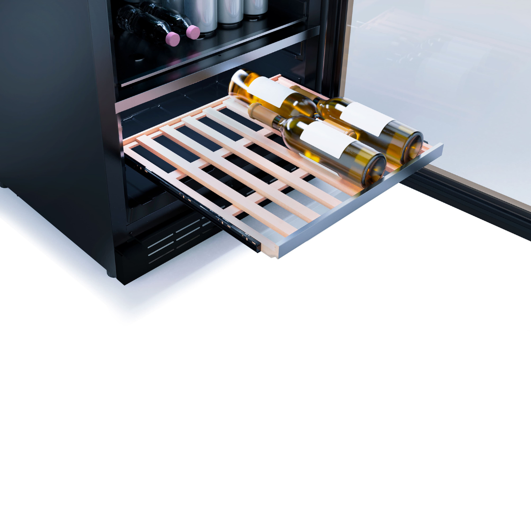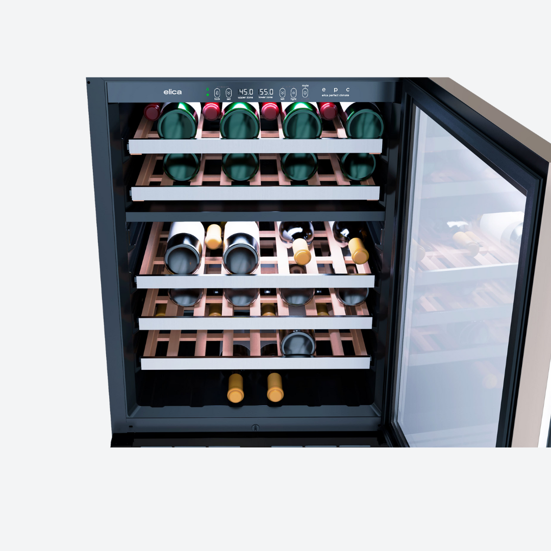 Una solución brillante que satisface todas sus necesidades, RISERVA - EBS52PR1 de 24”, cuenta con dos zonas de enfriamiento diferentes, ajustables a diferentes temperaturas para preservar una variedad de bebidas y vinos en su frescura óptima. Un marco Panel Ready y su puerta de vidrio resistente a los rayos UV de doble capa protegen las botellas del envejecimiento, mientras que la tecnología Perfect Climate (EPC) de Elica garantiza un flujo de aire constante entre las botellas para una conservación óptima.