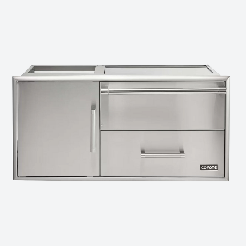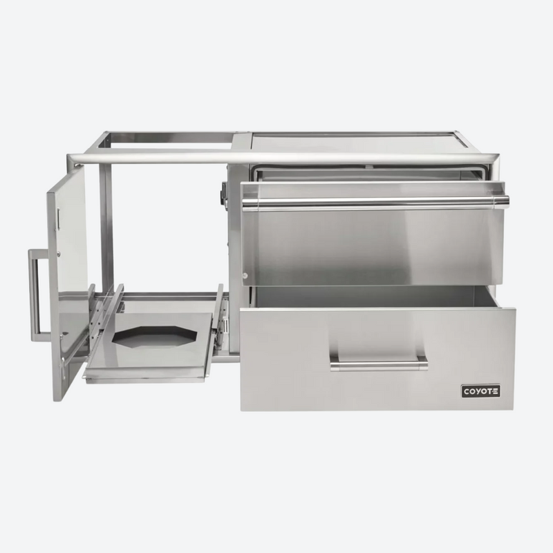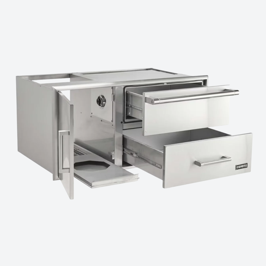 El conjunto Coyote de 42 pulgadas con puerta de acceso y cajón con cajón calentador es el complemento perfecto para cualquier cocina al aire libre, garantizando que sus alimentos se mantengan calientes y listos para servir. Esta unidad cuenta con certificación ETL para uso en exteriores y cumple con todos los estándares de seguridad y rendimiento. Cuenta con ruedas de deslizamiento suave para un fácil manejo del cajón y un diseño elegante con manijas de estilo profesional que realzan tanto la funcionalidad como la apariencia. Fabricado en acero inoxidable de grado 304, está diseñado para resistir las inclemencias del tiempo, brindando durabilidad y un aspecto elegante a su espacio de cocina al aire libre.