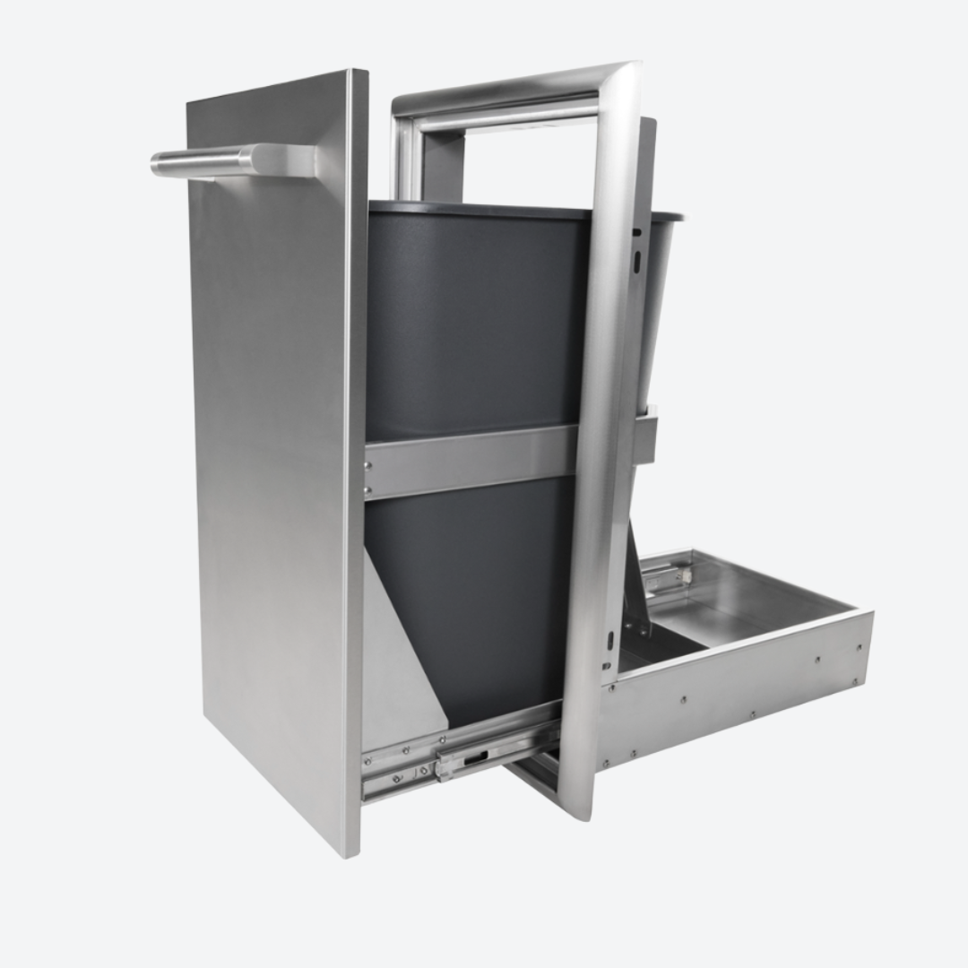 El cajón extraíble para basura y reciclaje Coyote de 15 pulgadas facilita la gestión de residuos en cualquier cocina exterior. Con un cubo de basura integrado de 13 galones, esta unidad ofrece un almacenamiento práctico con un aspecto elegante y profesional.
