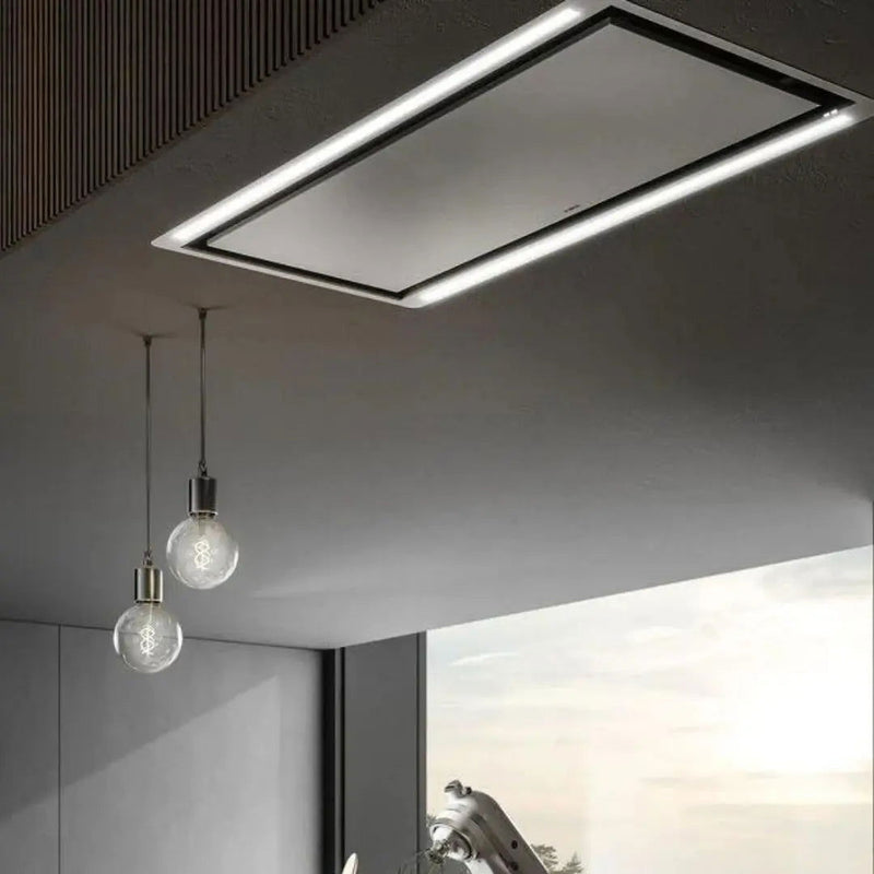 Descripción: Campana de techo elegante y moderna para una cocina con estilo arquitectónico, instalación empotrada que deja espacio libre sobre la encimera.