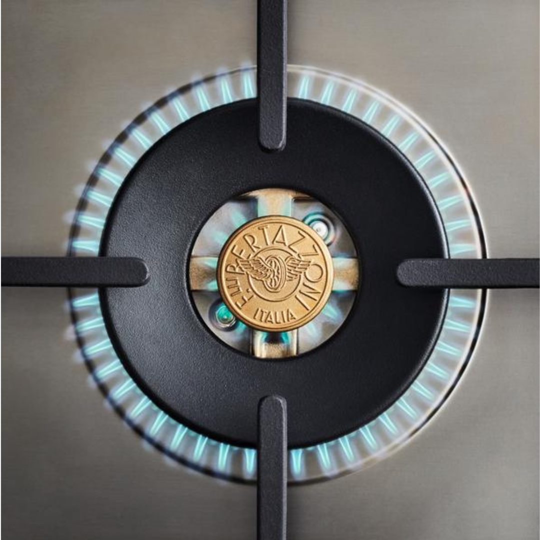 La placa principal de alta eficiencia con 6 quemadores de latón cuenta con 2 quemadores de doble anillo de 19,000 BTU que hierven agua en menos de 6 minutos (el mejor de su clase), y 4 quemadores MonoBloc adicionales de tamaño y potencia variables para adaptarse a cualquier estilo de cocina, con una cocción a fuego lento de 750 BTU. Incluye una gran plancha de hierro fundido extraíble.