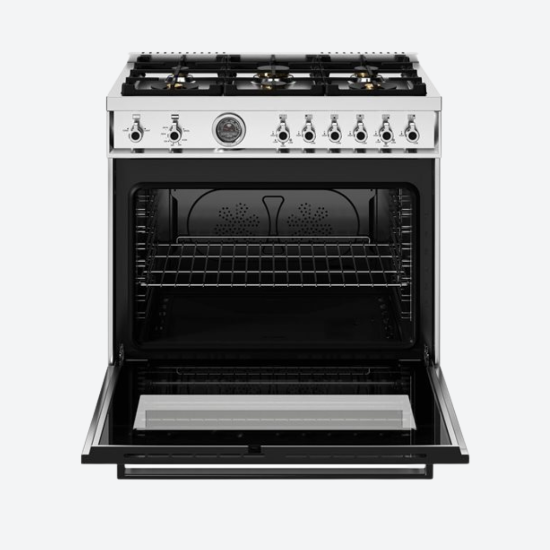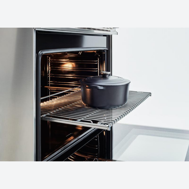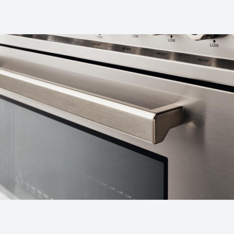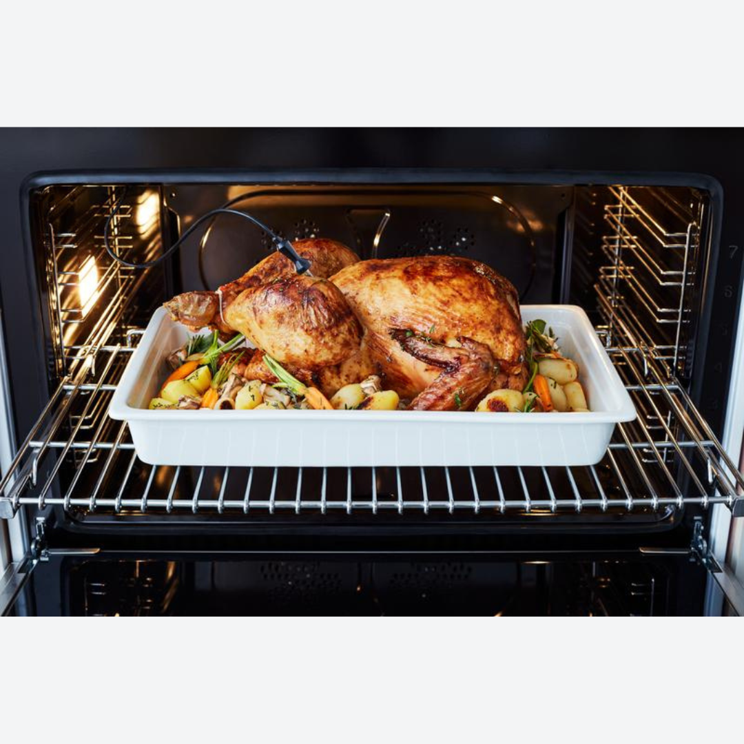 La cavidad del horno de 5.9 pies cúbicos es la más grande de su clase, con ventilador de convección doble para un flujo de aire equilibrado y una temperatura uniforme para hornear y asar en 7 niveles de parrilla. El elegante y amplio indicador de temperatura monitorea la temperatura real en el horno. La parrilla de gas infrarroja extra ancha es ideal para asar y sellar a fuego alto. El horno incluye prácticas características como deslizadores telescópicos suaves para las parrillas y puertas de cierre suave. La puerta interior de vidrio, de borde a borde, maximiza el volumen interior y se limpia fácilmente.
