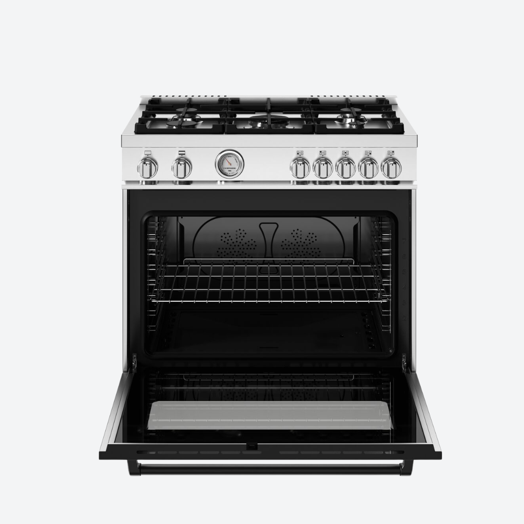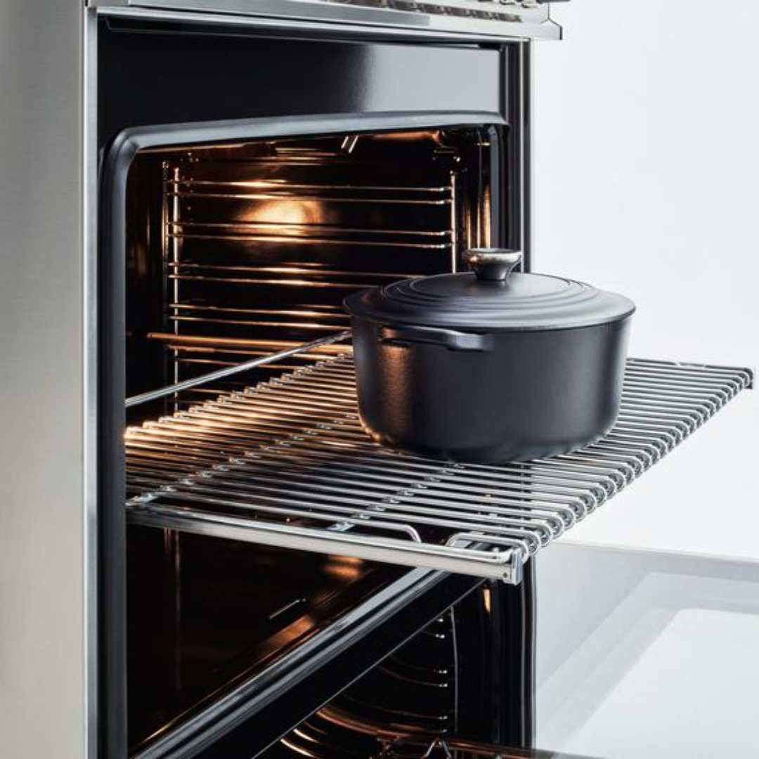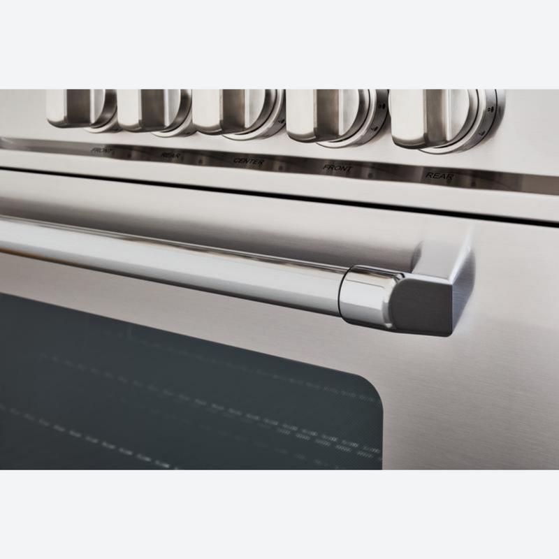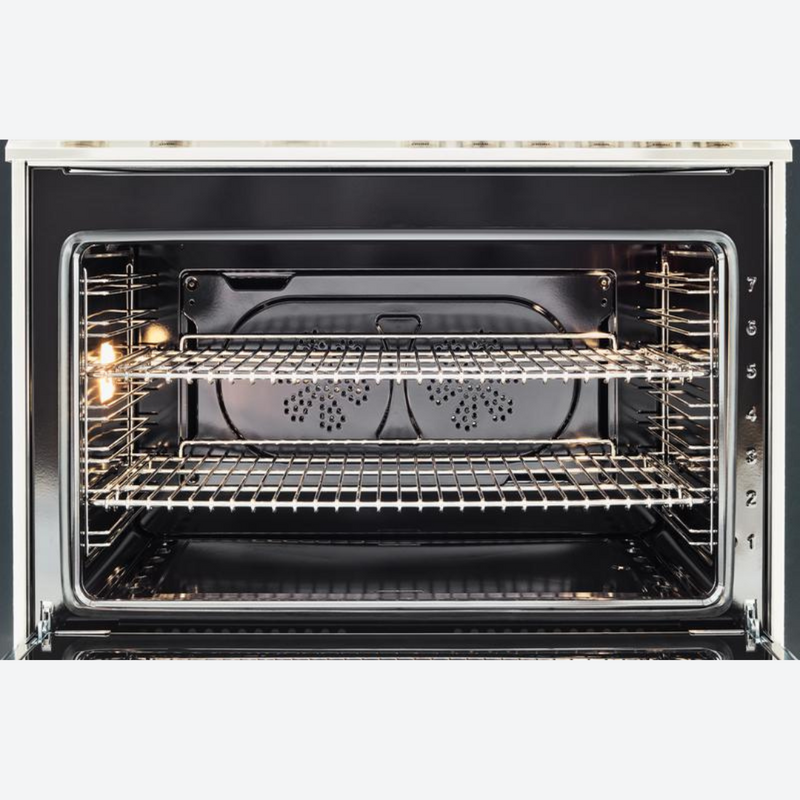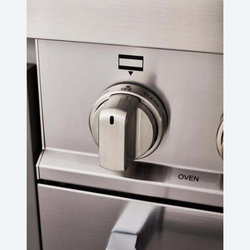 La cavidad del horno de 5.9 pies cúbicos es la más grande de su clase, con un ventilador de convección doble para un flujo de aire equilibrado y una temperatura uniforme para hornear y asar en 7 niveles de parrilla. El elegante y amplio indicador de temperatura monitorea la temperatura real en el horno. La parrilla de gas infrarroja extra ancha es ideal para asar y sellar a fuego alto. El horno cuenta con una puerta de movimiento suave. Las guías telescópicas suaves están disponibles como accesorios. La puerta interior de cristal del horno, de borde a borde, maximiza el volumen interior y se limpia fácilmente.