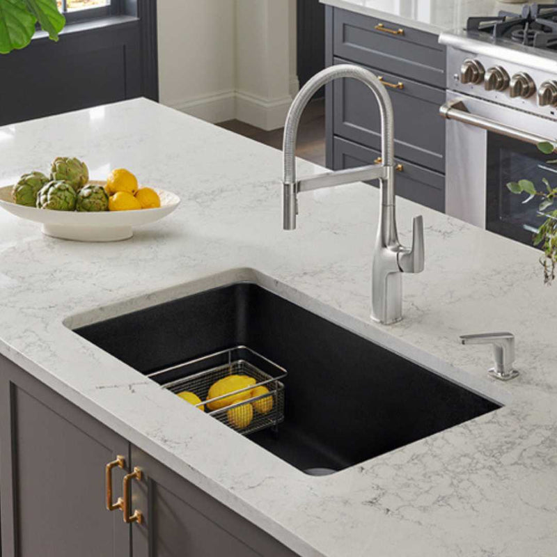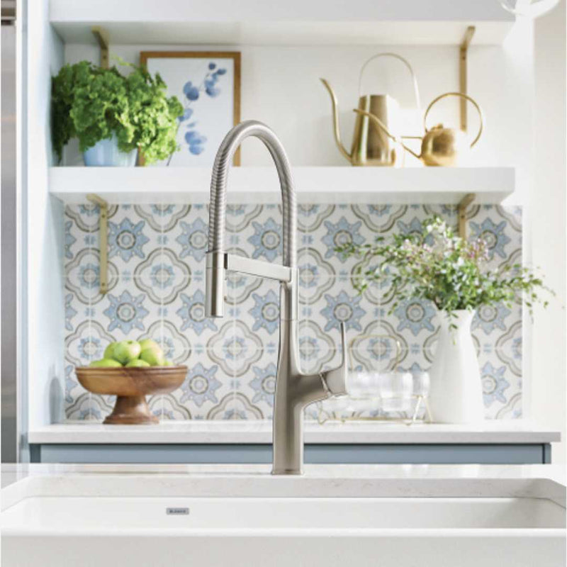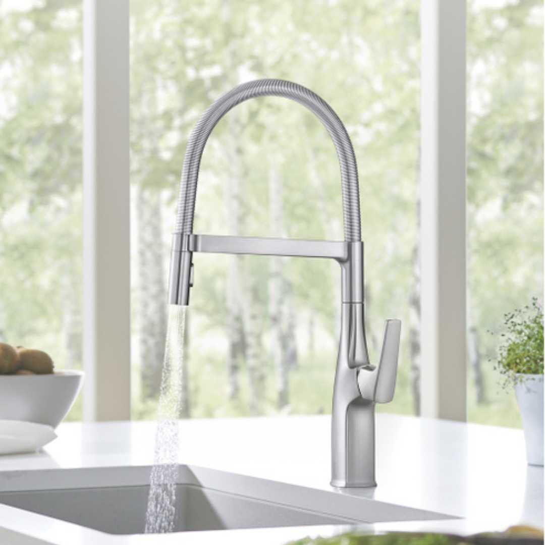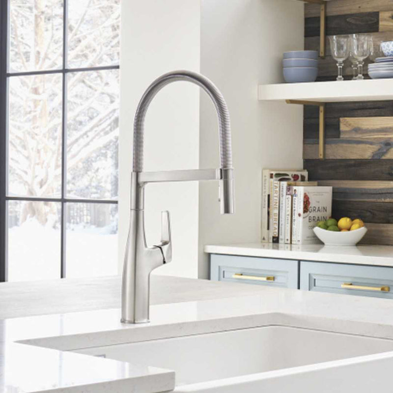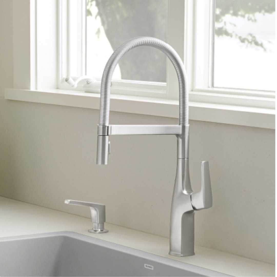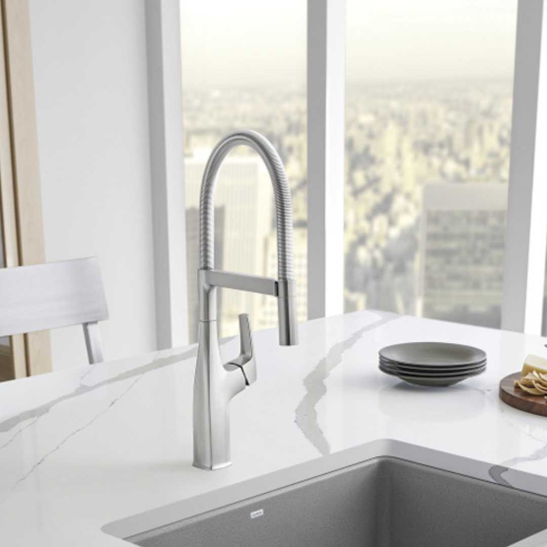 Experimenta la eficiencia y el diseño moderno con el grifo de cocina Blanco Rivana Semi-Pro 1.5 gpm. Fabricado en resistente acero inoxidable con acabado Cromo Pvd Steel, este grifo monomando ofrece un caudal de 1.5 galones por minuto, ideal para un uso responsable del agua. Su diseño semi-profesional incluye un cabezal de rociado extraíble (pull-down) y un brazo articulado que facilita la limpieza y el llenado de recipientes, aportando versatilidad a tu cocina. Con una única perforación para su instalación sobre cubierta, su montaje es sencillo.