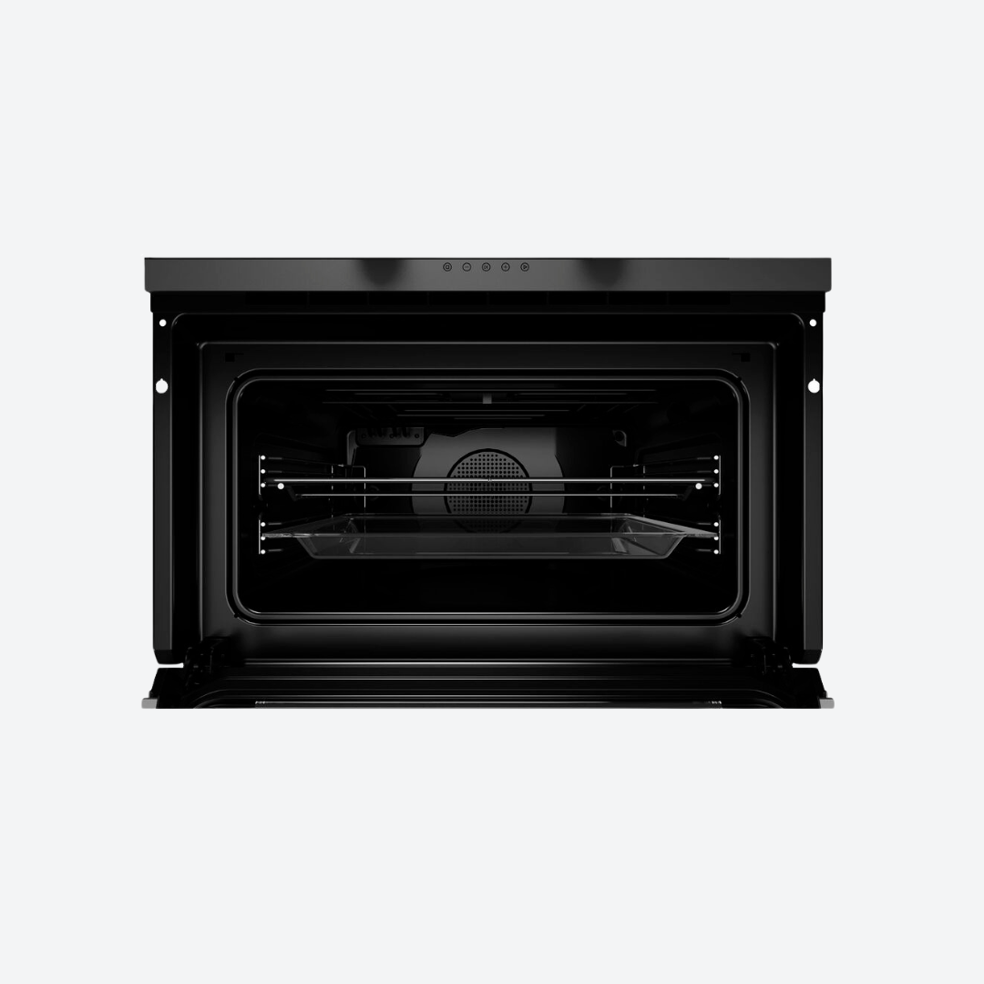 Puerta de triple cristal Ventilación tangencial Bloqueo de seguridad Desconexión automática al abrir la puerta Esmalte interior Crystal Clean Guía cromada telescópica Guías cromadas con cinco alturas de cocinado Parrilla cromada Bandeja profundo antivuelco Bandeja de cristal.