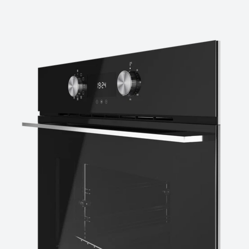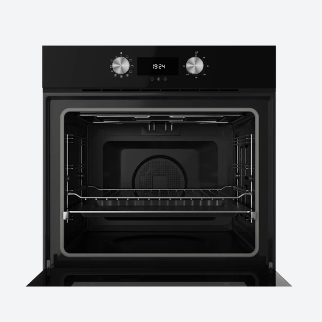 Su acabado en cristal negro antihuella y diseño sin marco (frameless) lo hacen ideal para cocinas modernas. Cuenta con capacidad de 70 litros, 9 funciones de cocción (incluyendo convección, grill, maxi grill y precalentamiento rápido), así como sistema de limpieza Hydroclean Pro, que facilita el mantenimiento del horno.  Su interfaz se compone de perillas ergonómicas y un display touch control con timer digital, mientras que la puerta de doble cristal con ventilación dinámica asegura seguridad y distribución uniforme del calor.