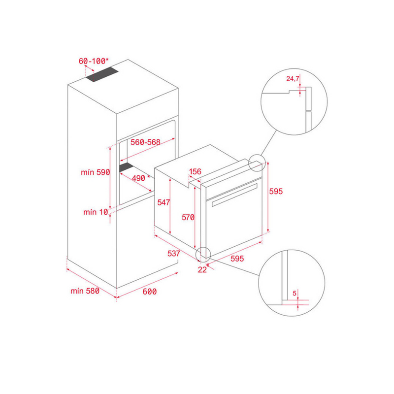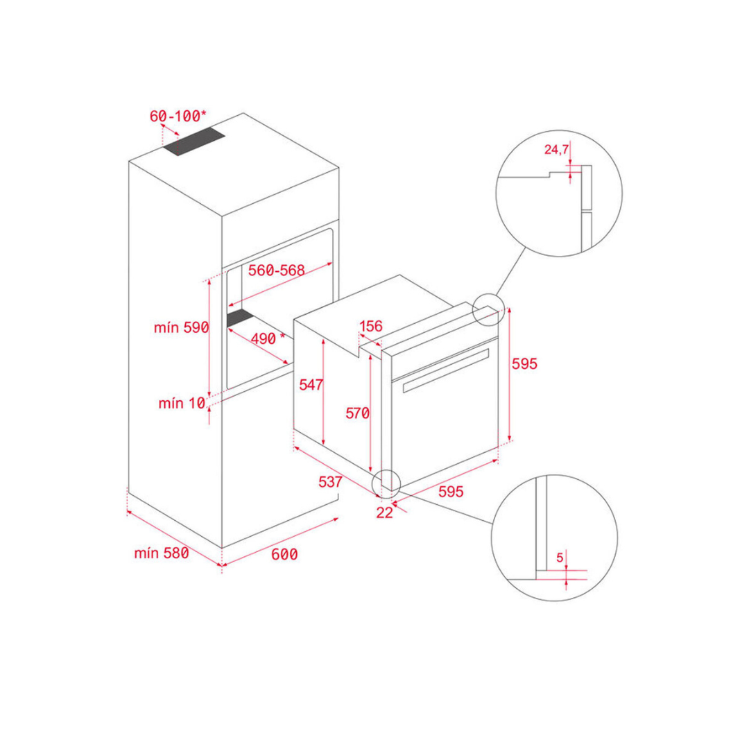 El interior está recubierto con esmalte Crystal Clean, y cuenta con guías cromadas con cinco alturas de cocinado, una guía telescópica, bandeja profunda esmaltada y parrilla cromada. Con una potencia máxima de 3,215 W, es una opción funcional, eficiente y estética para cualquier cocina.