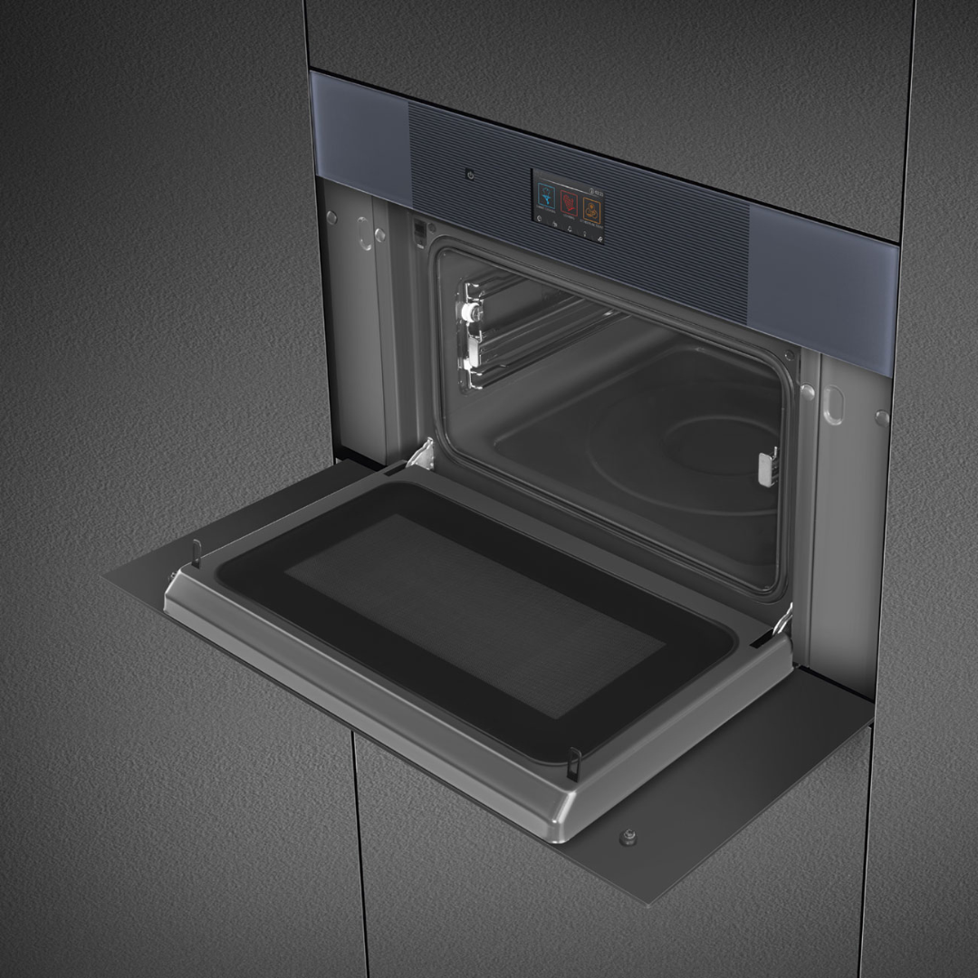 El SMEG SOCU3104MCG es un horno combinado de microondas de 30 pulgadas de la elegante línea Neptune Grey, diseñado para cocinas modernas que buscan estilo y versatilidad. Este modelo integra las funciones de horno de convección y microondas con grill, ofreciendo alrededor de 50 L de capacidad útil y temperaturas ajustables entre 30 °C y 250 °C.