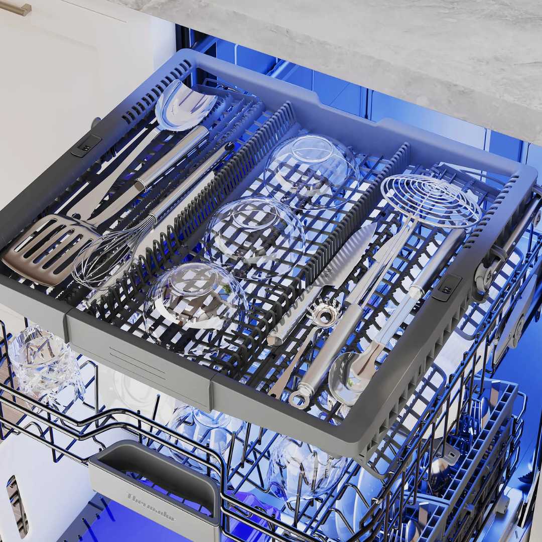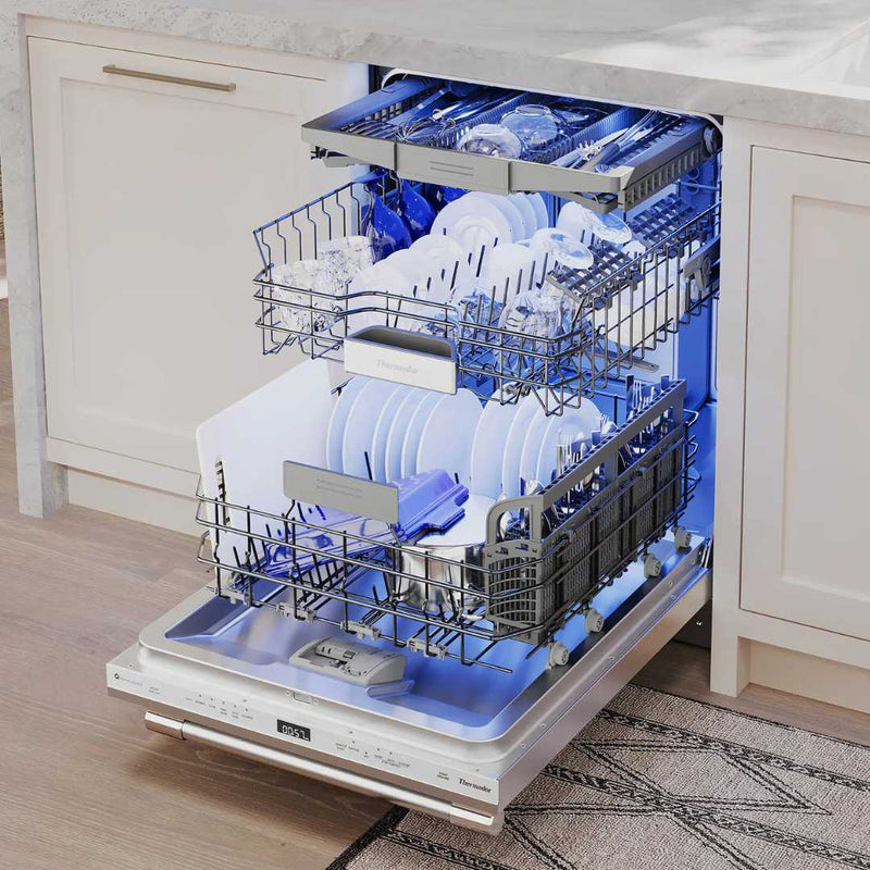 El lavavajillas empotrable Thermador DWHD660EFP Sapphire® de 24″ en acero inoxidable es una solución premium para cocinas modernas que combina limpieza potente, secado superior y tecnología inteligente en un diseño profesional. Con capacidad para 16 servicios de cubiertos, este modelo ofrece hasta nueve ciclos de lavado personalizables, incluyendo opciones exclusivas como StarDry™ con zeolita, que absorbe la humedad para un secado más completo, y ZoneControl™, que permite ajustar la potencia de limpieza según la ubicación de los platos difíciles. Opera de forma silenciosa a solo 44 dB y cuenta con un tercer rack ajustable tipo Chef’s Tool Drawer® que maximiza el espacio para utensilios y artículos voluminosos. Además, incorpora conectividad Wi-Fi con Home Connect® para iniciar o monitorear ciclos desde tu smartphone, Sapphire Glow™ para iluminación interior elegante y Blue PowerBeam® que indica el estado de funcionamiento con una luz en el piso.