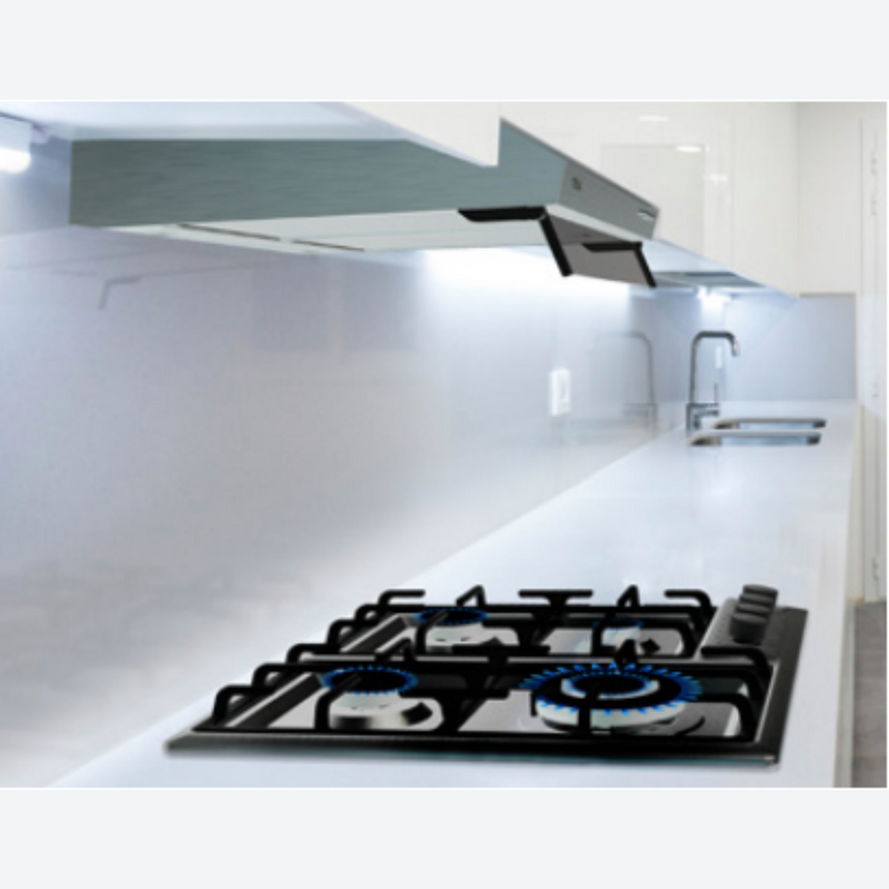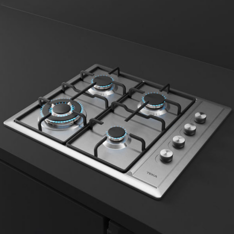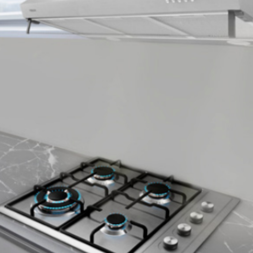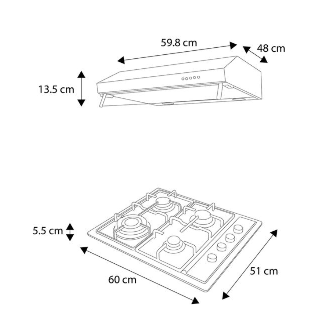 Combo de parrilla de gas de 4 quemadores y campana de pared de 60cm, muy fácil de instalar cubierta de acero inoxidable con parrillas y tapas de quemadores de hierro fundido. Con perillas ergonómicas laterales, con tres niveles de potencia, y encendido electrónico integrado en cada perilla. Quemadores de alta eficiencia a gas. 1 quemador de triple anillo, 2 quemadores semi rápidos, 1 quemador auxiliar.