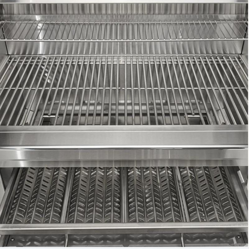 Parrilla de carbón empotrada de acero inoxidable de 36 pulgadas con 875 pulgadas cuadradas de área de cocción total, indicador de temperatura, reguladores ajustables y bandeja para carbón.