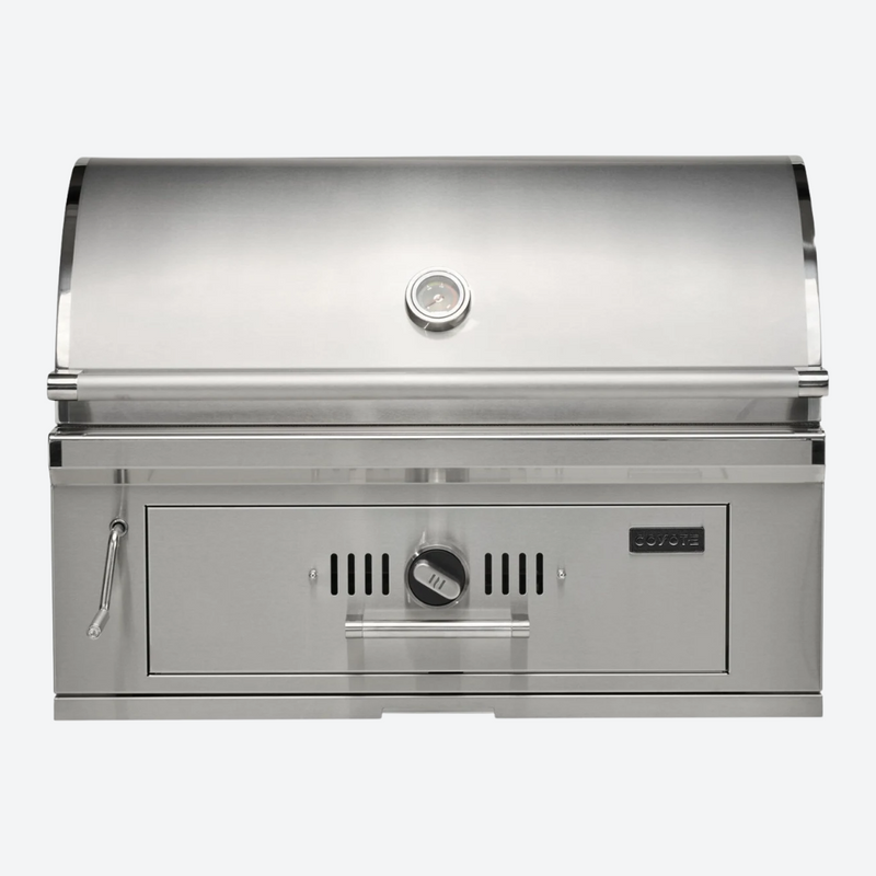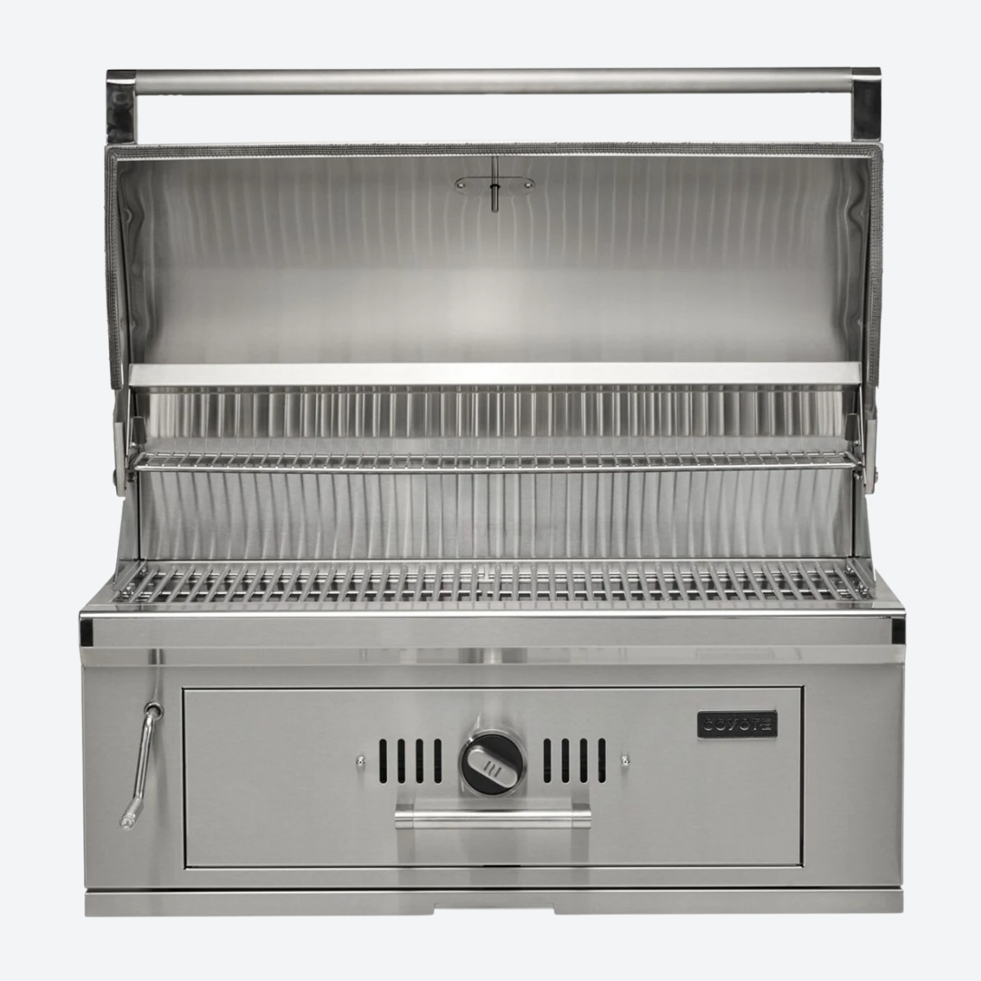 La parrilla de carbón empotrable Coyote de 91 cm (36 pulgadas) es una solución de alto rendimiento para cocinar al aire libre, diseñada para los amantes de la parrilla. Fabricada en resistente acero inoxidable 304, cuenta con una bandeja de combustible ajustable,  una campana de doble pared para una excelente retención del calor. Con una amplia área de cocción y una construcción de calidad profesional, esta parrilla ofrece un rendimiento excepcional para cocinar al carbón en el patio.