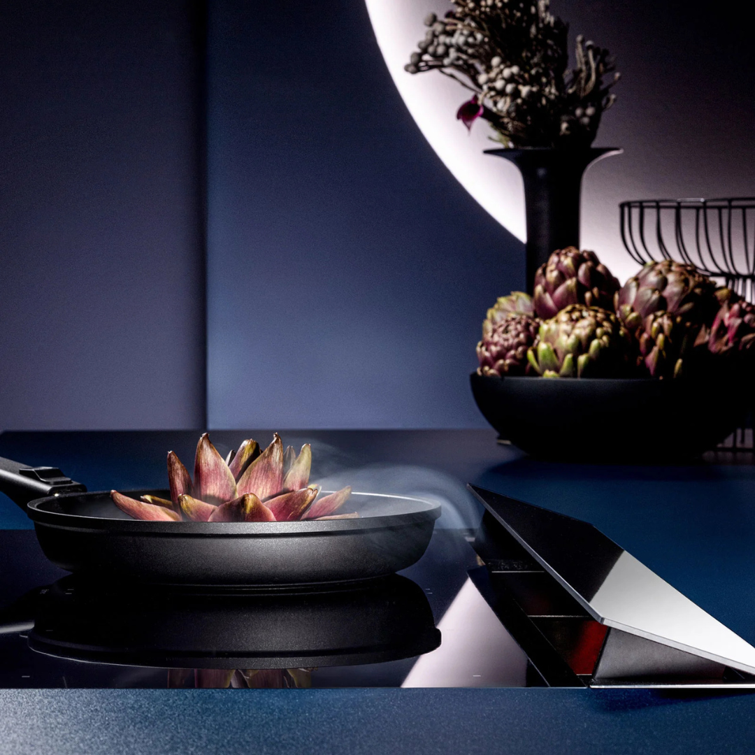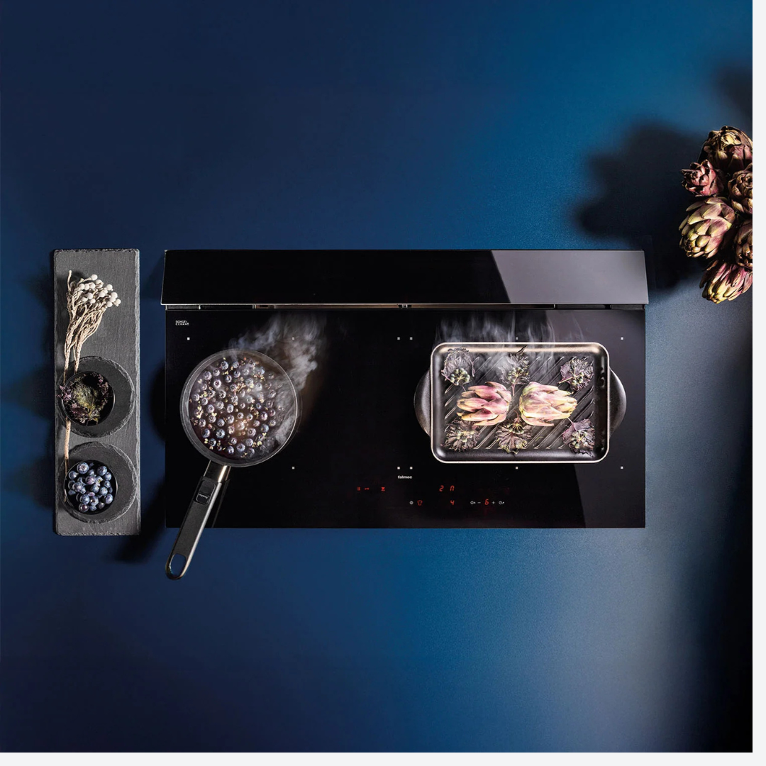 Cuando está en funcionamiento, la parte trasera se abre automáticamente para extraer los humos de la cocción, de forma perfectamente equilibrada en las cuatro zonas de inducción alineadas.