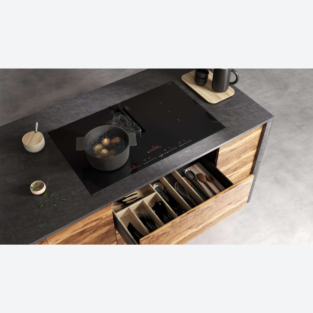 Con un sistema de extracción integrado de 1,020 m3/h, el Nikola Tesla Flux está disponible en dos anchos, 76 y 90 cm, lo que le permite adaptarse a diferentes tamaños de cocina. Ofrece un rendimiento excepcional en la captura de aire, eliminando eficientemente los olores y el humo con un bajo nivel de ruido. Además, cuenta con un kit de filtros cerámicos de carbono de larga duración, permitiendo su transformación en una opción de recirculación.