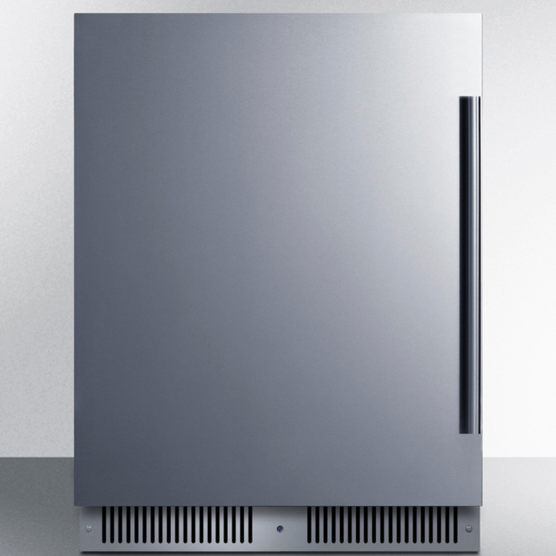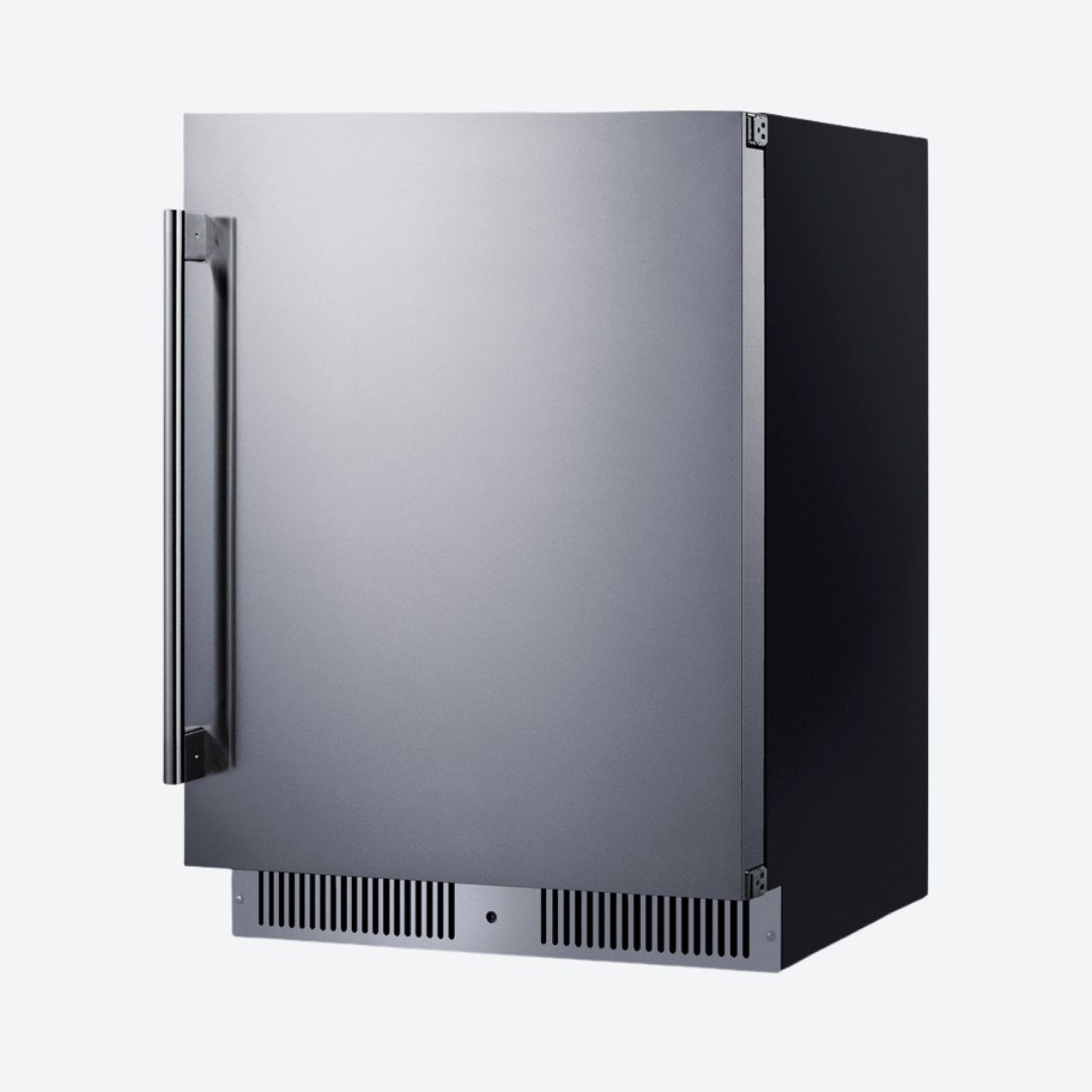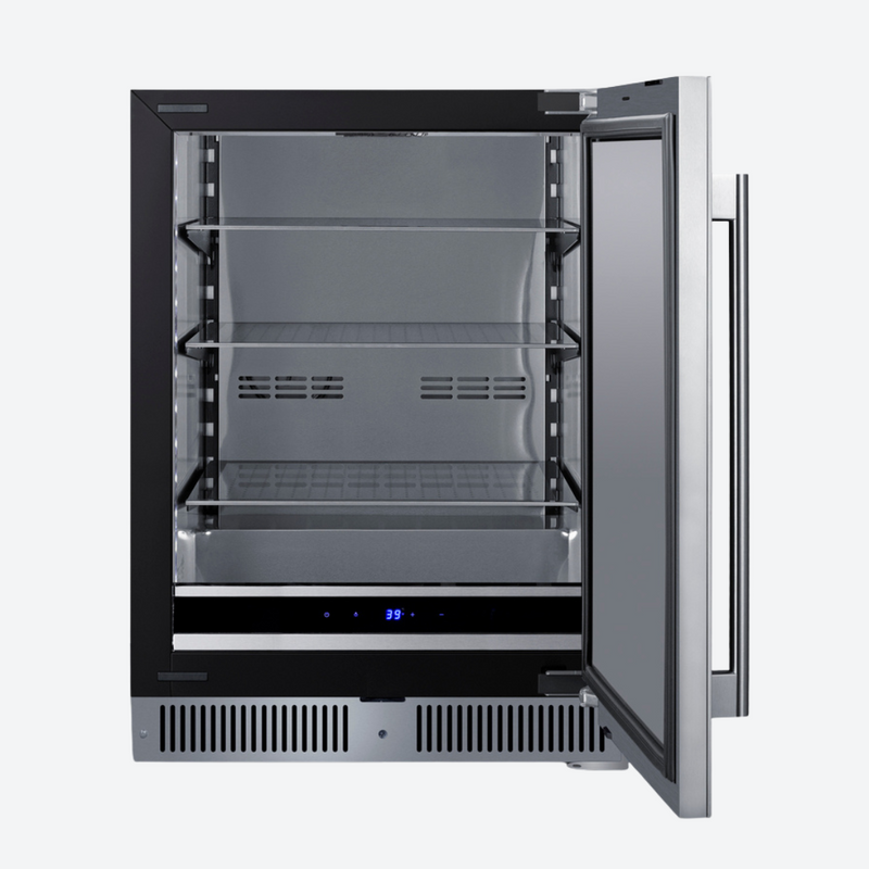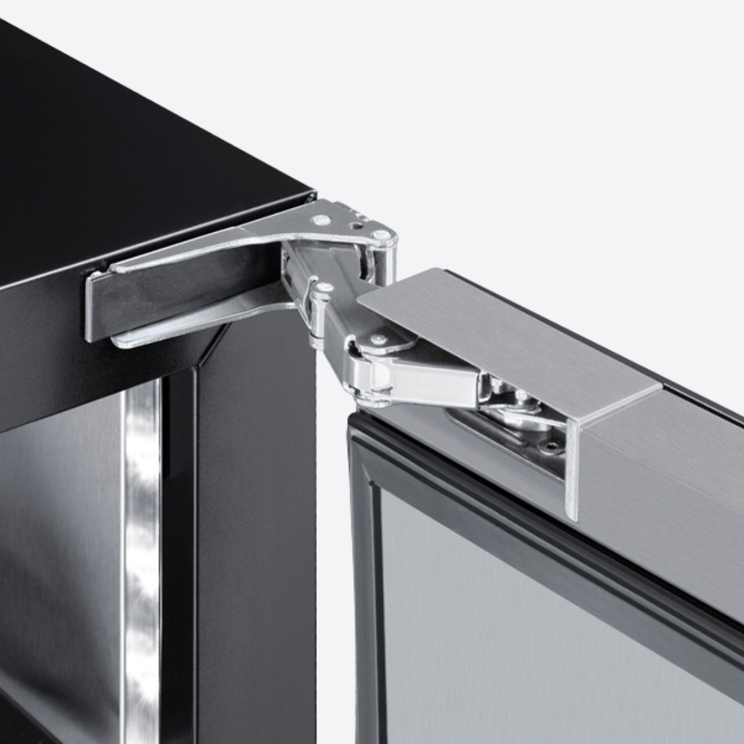 El SDHR2444 es un refrigerador de 61 cm de ancho y menos de 45 cm de profundidad. Su altura de 86 cm se adapta a encimeras estándar. Su sistema de ventilación frontal permite su instalación empotrada, mientras que su gabinete negro con acabado completo también permite su uso independiente. Cuenta con una puerta revestida de acero inoxidable con bisagra europea totalmente articulada para una apertura más suave y una manija profesional que completa su diseño. Esta unidad cuenta con una parte trasera sellada y un cable en ángulo recto para un mejor ajuste. La cerradura se encuentra en el zócalo para mayor comodidad y seguridad.