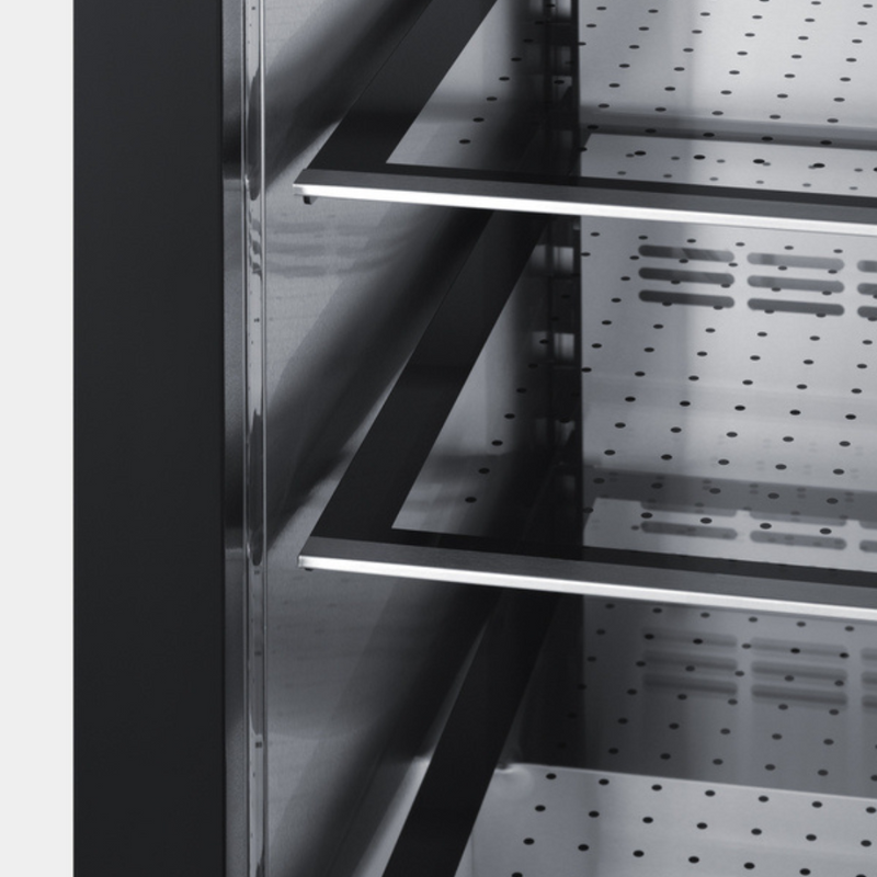 En su interior, la unidad cuenta con una construcción de acero inoxidable para mayor durabilidad e higiene. El sistema de refrigeración por ventilador garantiza una distribución uniforme de la temperatura y una rápida recuperación. La iluminación LED empotrada le da un aspecto atractivo y eficiente. El termostato digital facilita el control de la temperatura interior. Esta unidad incluye un sistema de estanterías voladizas con estantes de vidrio para un almacenamiento flexible. Otras características incluyen una alarma de puerta abierta, una alarma de alta temperatura y un modo Sabbath que permite desactivar algunos elementos eléctricos durante periodos de observación de hasta 96 horas.