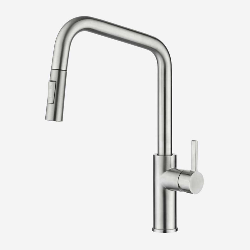 Mezcladora monomando extraíble para cocina. Cabezal con doble función y cuerpo escuadra. Construida en Acero Inoxidable 304.
