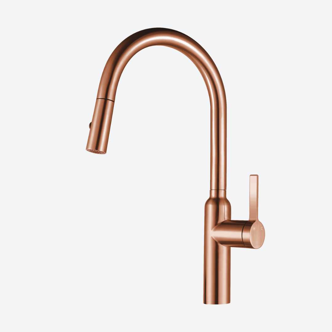 Mezcladora monomando con cuerpo redondo, cuello alto y cabezal de doble función. Fabricada en Acero Inoxidable 304 con acabado Rose Gold PVD+Nano. Dimensiones: 48.0 x 28.0 cm.
