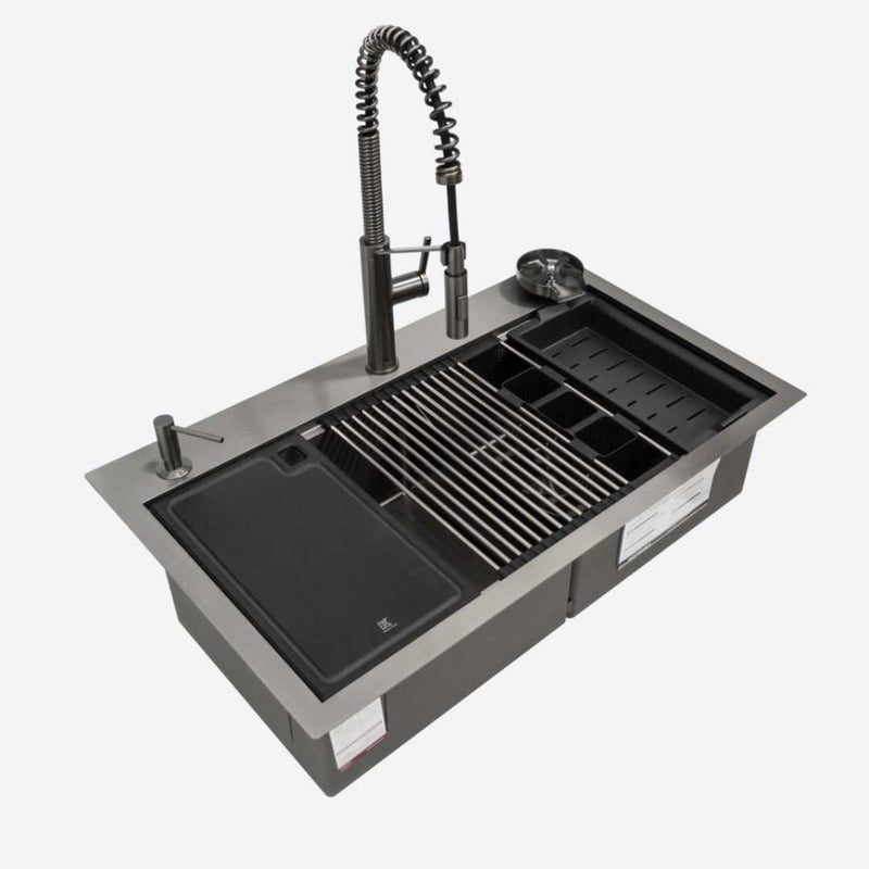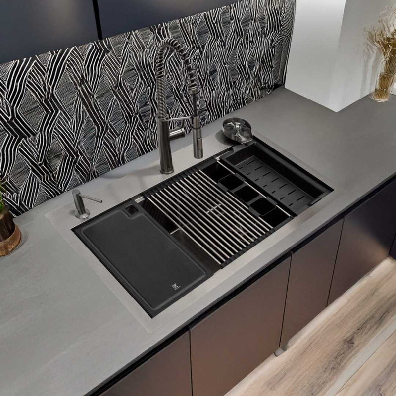 El KELE Workstation KWS0210A-BG redefine la experiencia en la cocina con un diseño pensado para el trabajo eficiente y elegante. Su acabado Black Gun PVD y sus accesorios inteligentes lo convierten en una estación completa que combina rendimiento profesional y estilo contemporáneo.