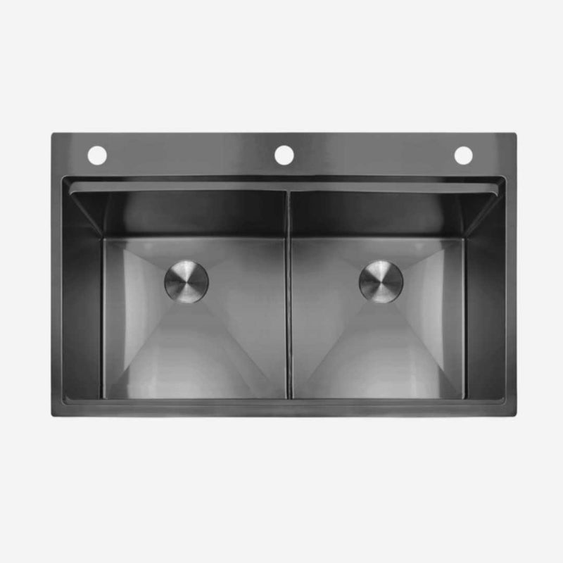 De dos tinas amplias, fabricada en acero inoxidable 304 con profundidad de 254 mm y contorno de 940 × 559 mm. Su calibre 16 y recubrimiento posterior de poliuretano brindan resistencia, durabilidad y una notable reducción de ruido. El acabado Black Gun PVD aporta un toque sofisticado y moderno que realza cualquier espacio.
